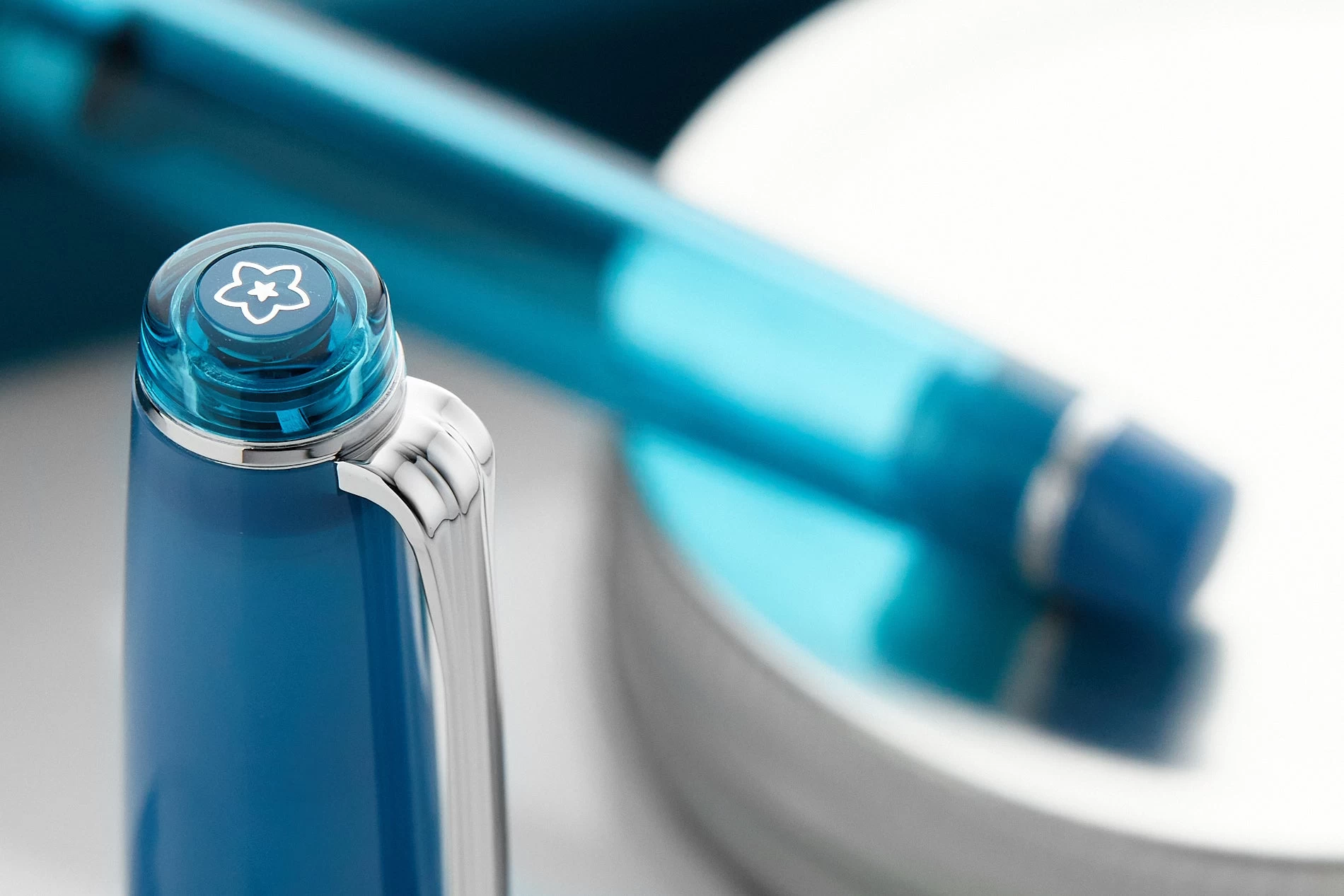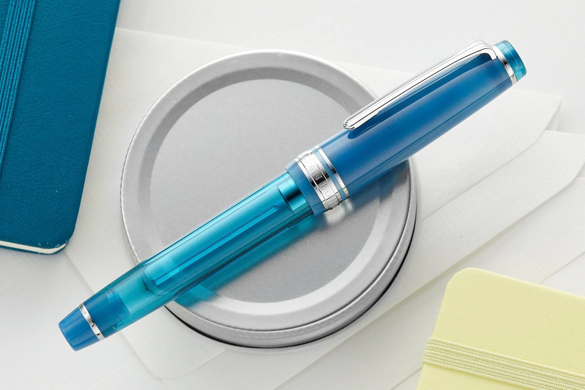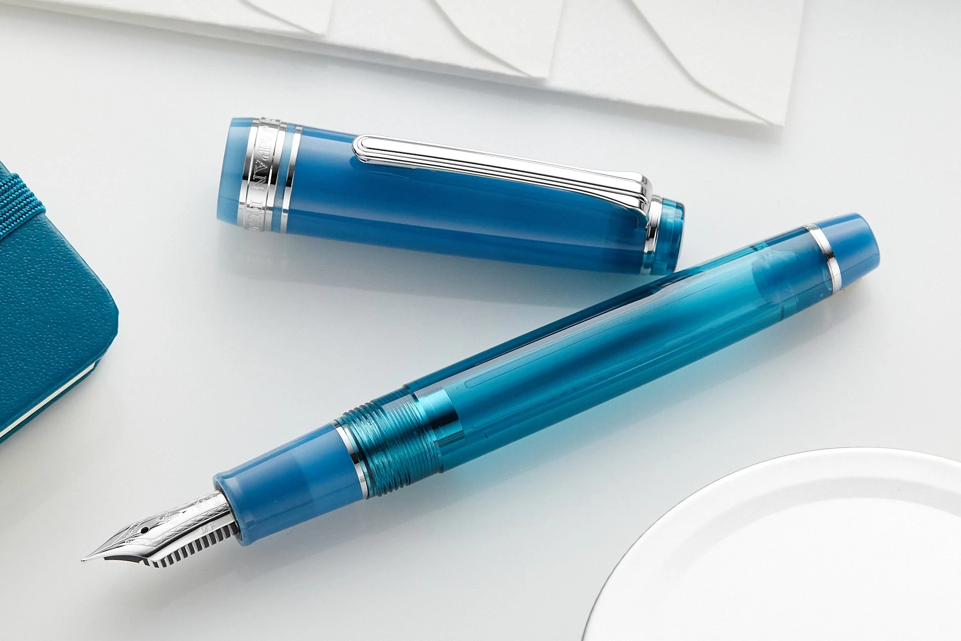 More companion pens to the much-loved Manyo inks are here! This Violet Pro Gear Slim combines the soothing blue tones of Kikyou and Sumire to create the gentle effect of wild violets in a peaceful field. The translucent body is complemented by silver accents and the top finial features a flower.