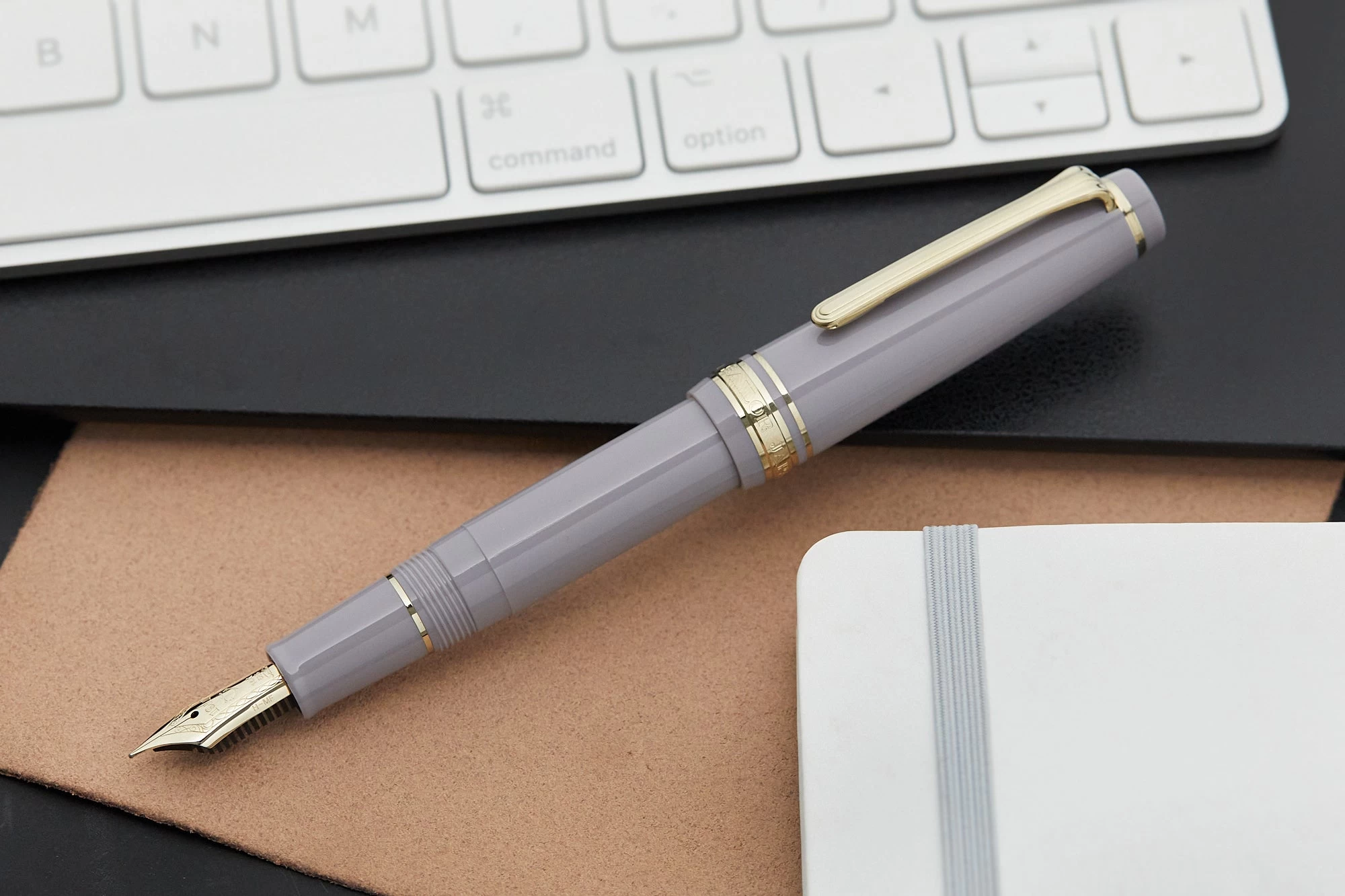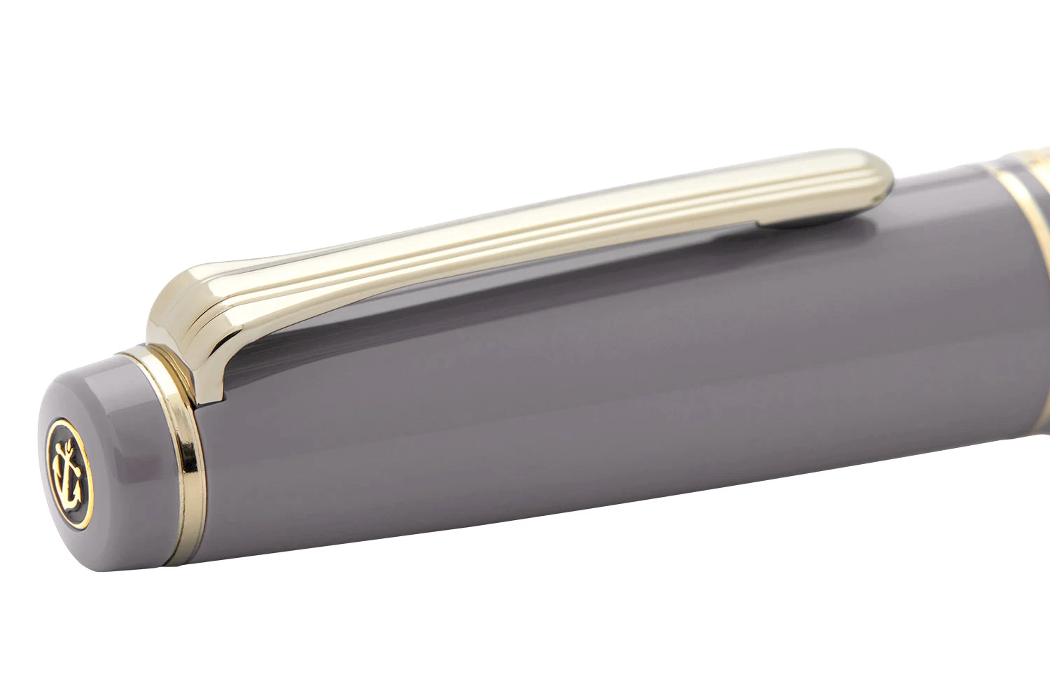 This Sailor Pro Gear Slim Mini fountain pen features a gray resin body and cap and is complemented by gold-plated accents. The flat top cap features the Sailor anchor logo inset into the top finial. This pocket-sized compact fountain pen comes equipped with Sailor’s legendary 14k yellow gold nib in medium fine. The cap screws open and close, and can be pushed to post securely onto the back of the barrel when writing.