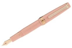 This Sailor Pro Gear Slim Mini fountain pen features a pale pink resin body and cap and is complemented by gold-plated accents. The flat top cap features the Sailor anchor logo inset into the top finial. This pocket-sized compact fountain pen comes equipped with Sailor’s legendary 14k yellow gold nib in medium fine. The cap screws open and close, and can be pushed to post securely onto the back of the barrel when writing.