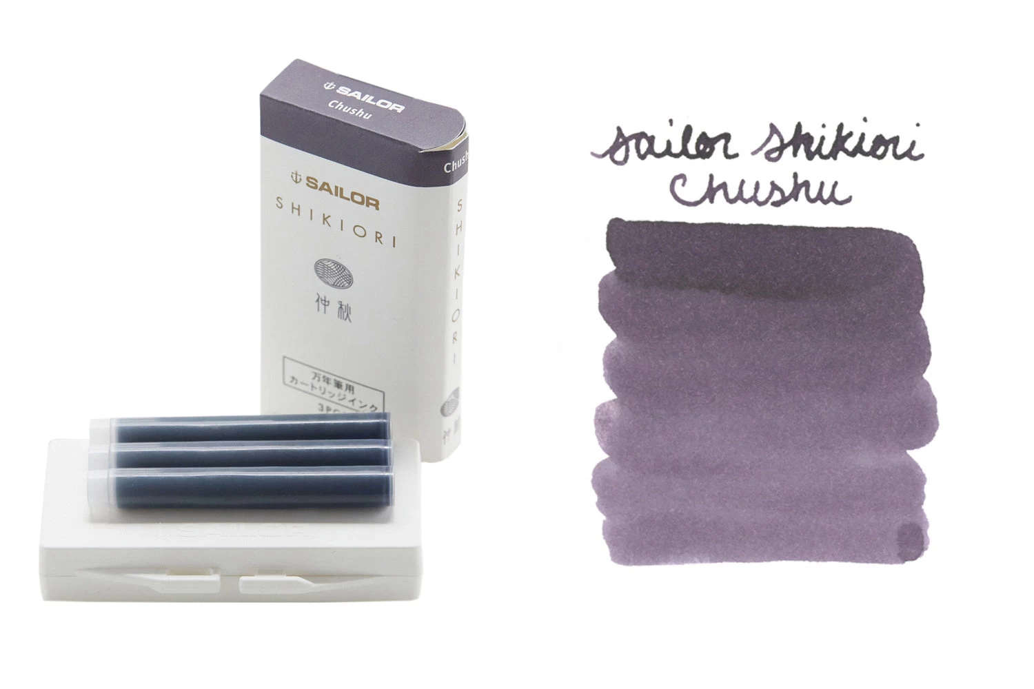 Boxed set of 3 Sailor Shikiori Chushu fountain pen ink cartridges. Chushu, or Mid-Autumn Grey, is a very dark grey with just a hint of purple.