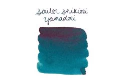 2ml sample of Sailor Shikiori Yamadori fountain pen ink, in a labeled plastic vial. Yamadori, or Copper Pheasant, is a beautiful teal blue/green.