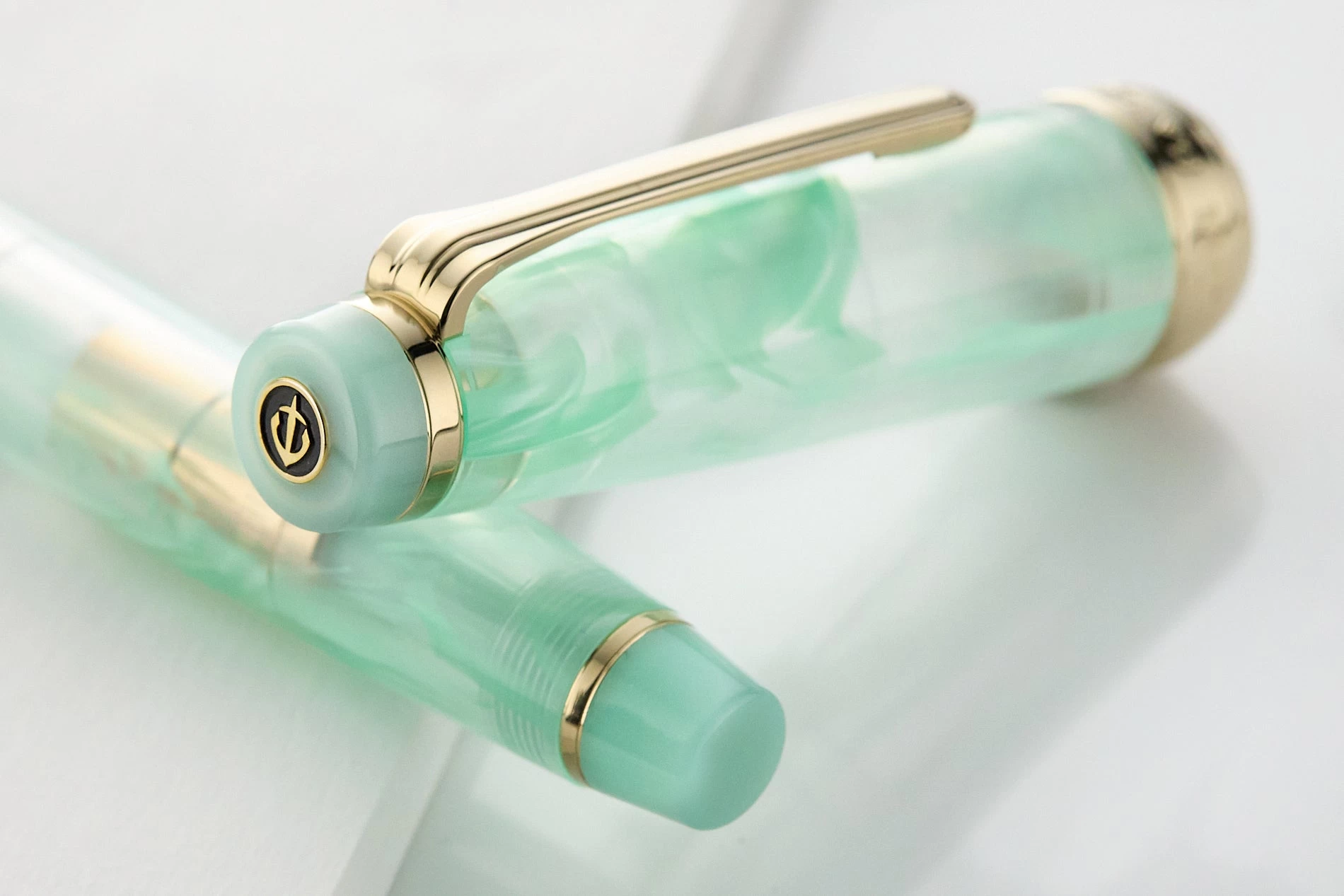 The Sailor Veilio Pearl Mint fountain pen shines with a refreshing mint hue on its finials, a dreamy swirling minty motif throughout its translucent body, and the elegance of IP gold details shimmering both within and externally. This remarkable pen features Sailor’s smaller 21K gold nib, which offers superior elasticity and feedback for an unmatched writing experience.