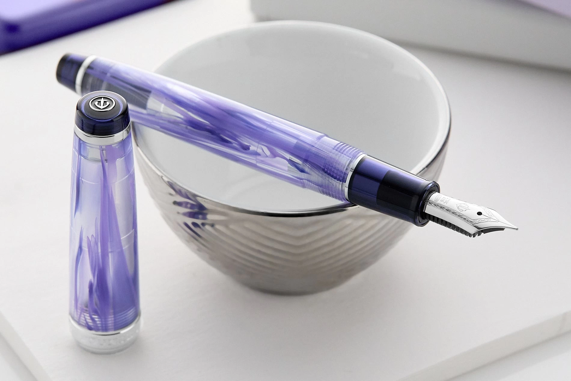 The Sailor Veilio Violet fountain pen exudes a dark violet on its finials and grip section, an enchanting marble of lighter violet coursing across the body, and silver details that stand out, reflecting the intricacy of Sailor’s design. This remarkable pen features Sailor’s smaller 21K gold nib, which offers superior elasticity and feedback for an unmatched writing experience.