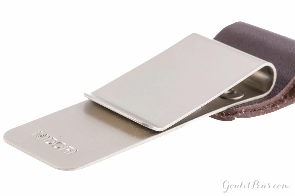 Attach this to the leather cover of the Traveler’s Notebook to hold a pen. It can hold pens of diameter up to 12mm. Metal clip, brown leather pen holder.