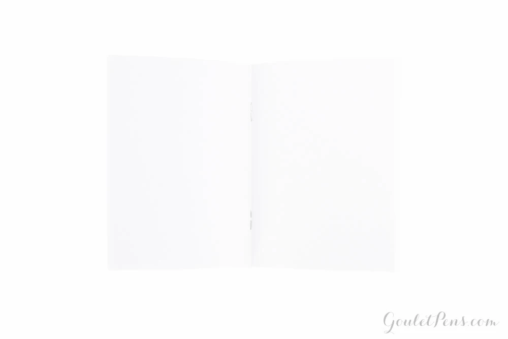 This refill for the passport size Traveler’s Notebook measures 8.9cm x 12.4cm (approximately 3.5in x 4.88in), and contains 32 sheets (64 pages) of white fountain pen friendly blank MD paper.