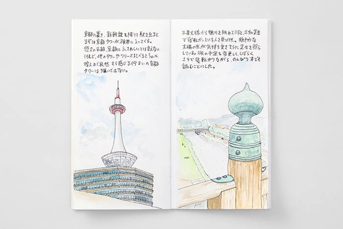 This notebook refill is perfect for watercolors because it is water-resistant. Watercolor Paper that is a little thicker and more textured than “012 Sketch Paper” is also perfect for pencil and pen sketches or collages of photos and tickets. The pages are perforated so after you draw on them, the regular size can be sent as a picture postcard, while the passport size is ideal for a hand-drawn card with a message.
