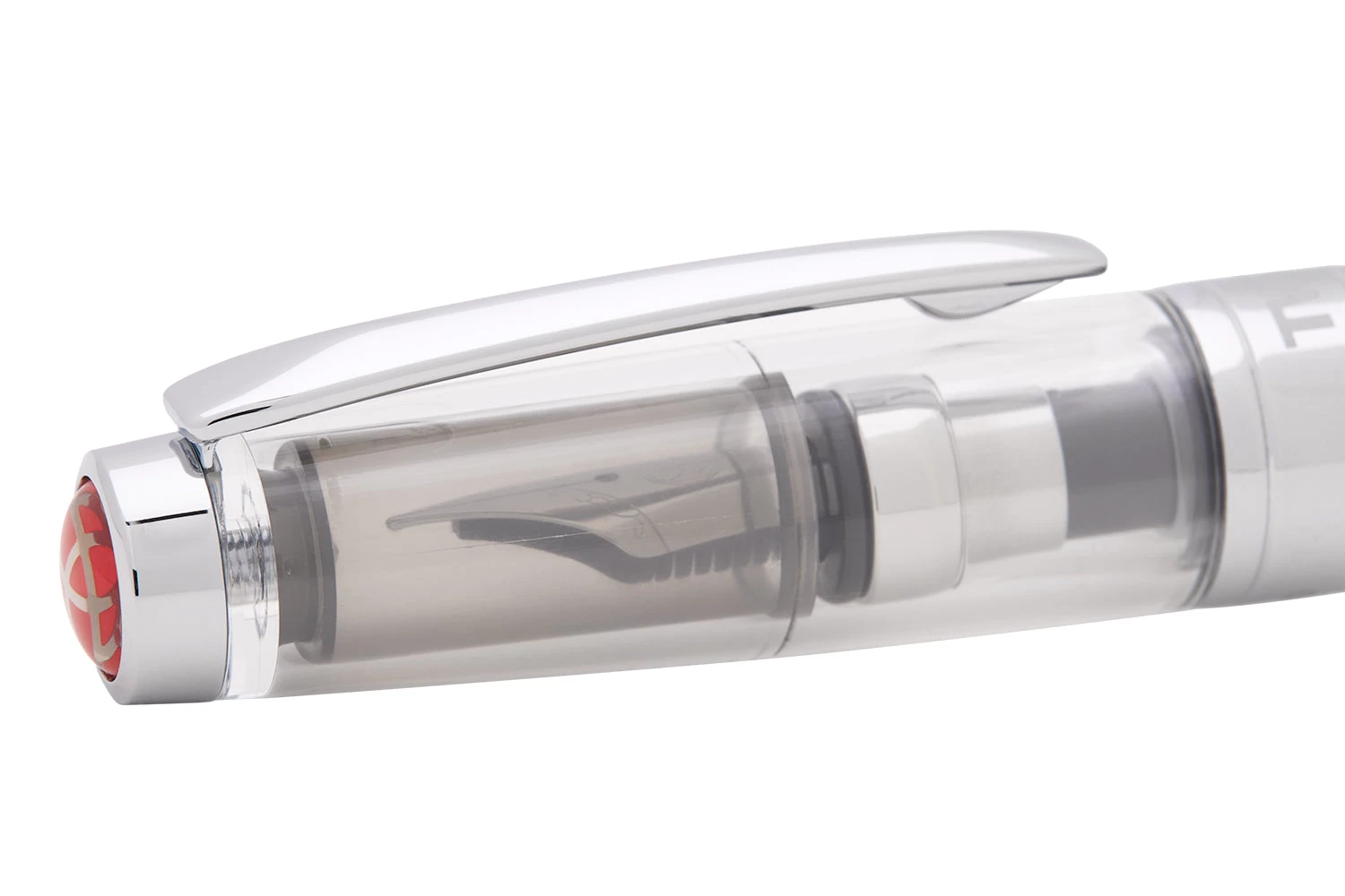 The TWSBI Diamond 580 comes with a benchmark piston ink-filling mechanism and has all detachable parts. The clear demonstrator barrel allows you to see your ink color and remaining ink level. It has a clear grip section and screw-cap. It comes with a stainless steel nib and is presented in a modern clear display case.