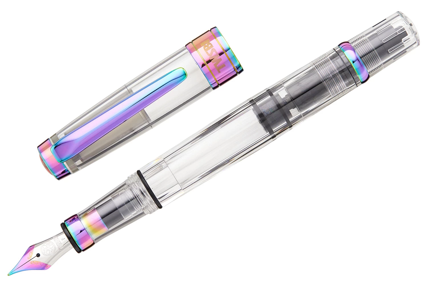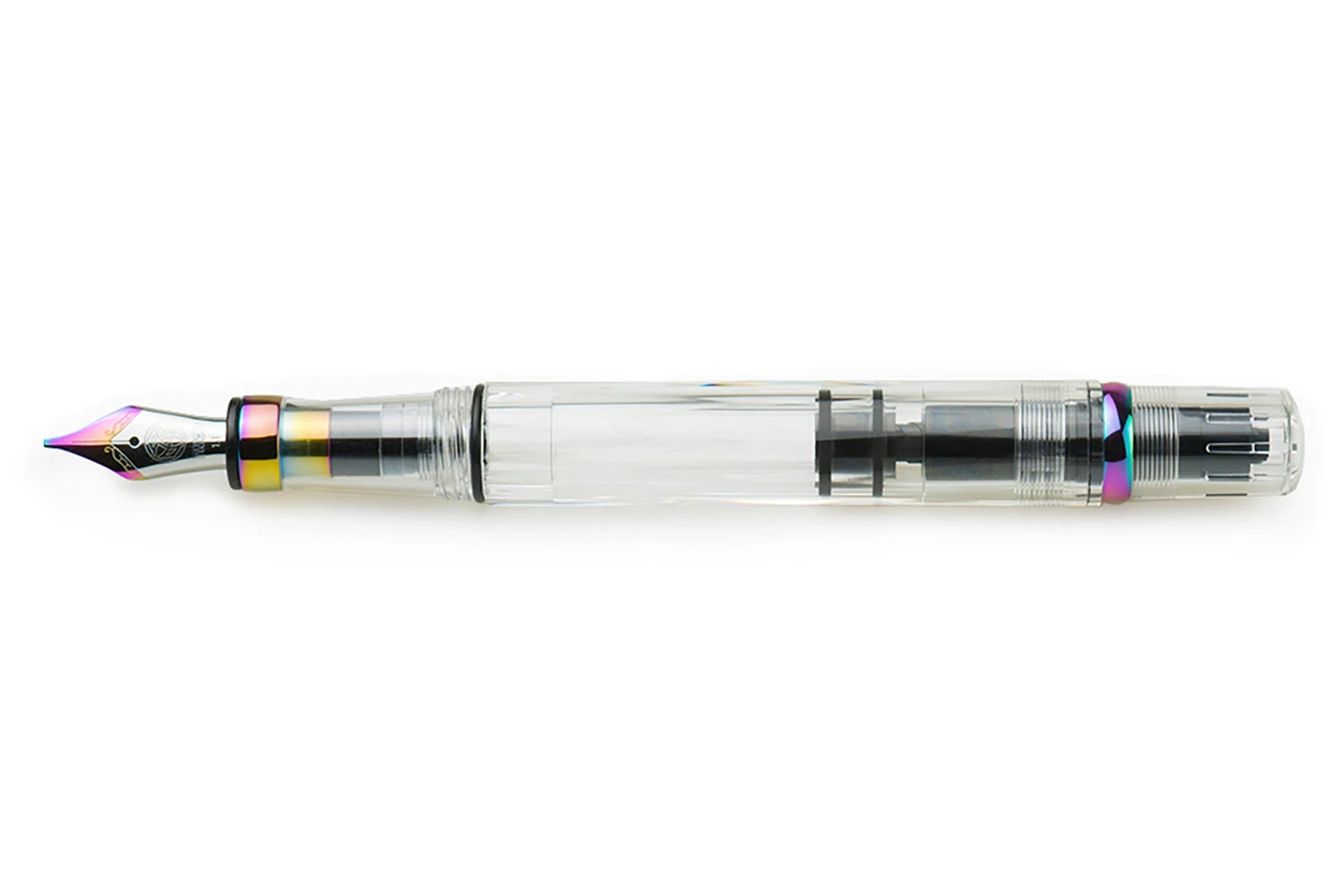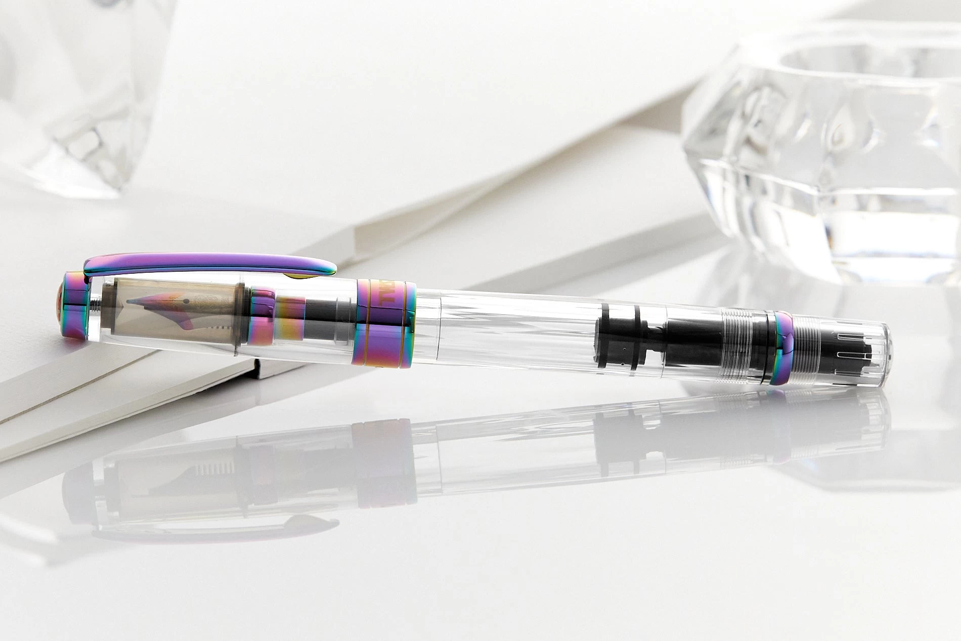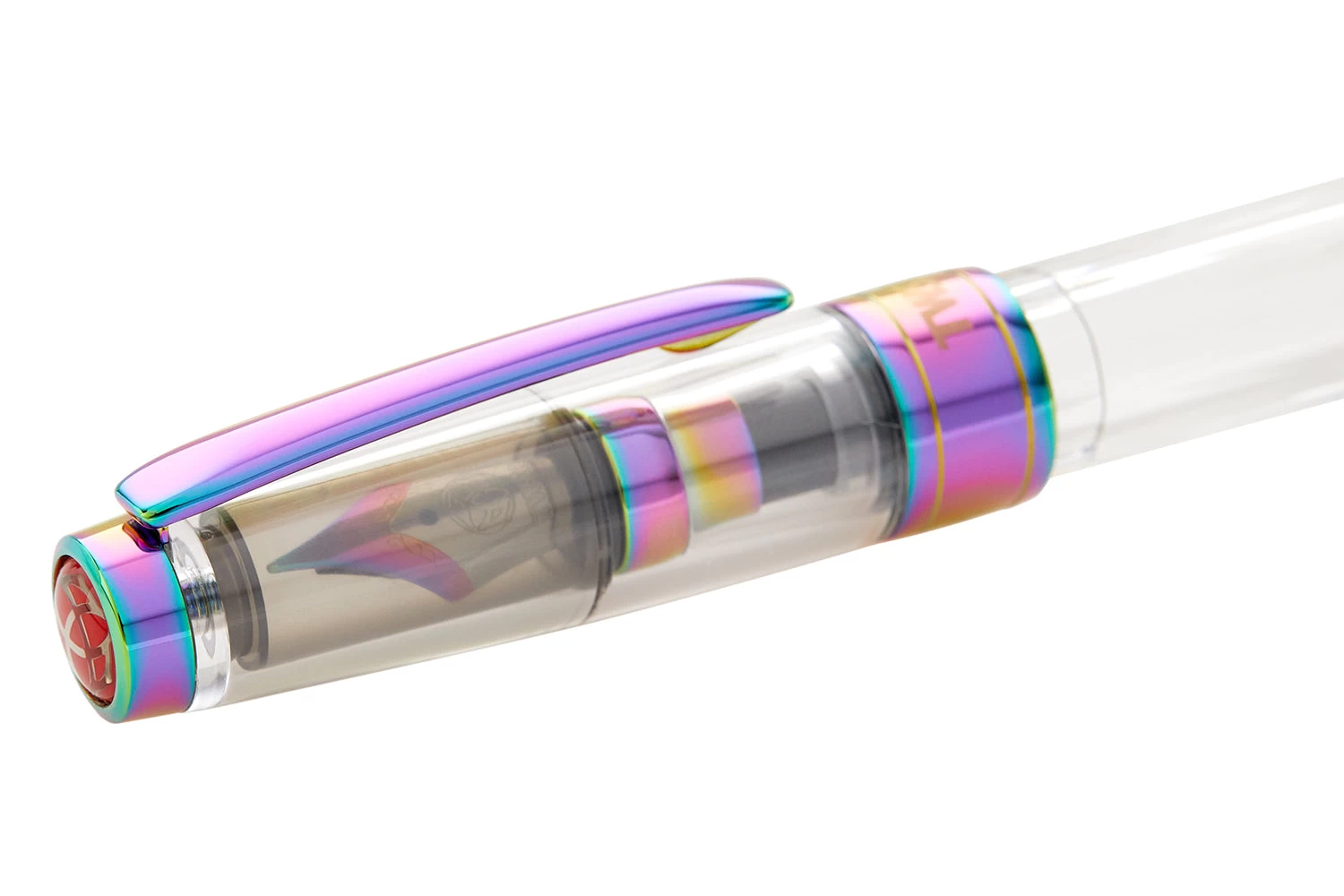 This fountain pen features a clear demonstrator body with rainbow-colored iridescent trim and a stainless steel nib accented with iridescent color. The clear demonstrator barrel allows you to see your ink color and remaining ink level. It has a clear grip section and screw-cap, and is presented in a modern clear display case.