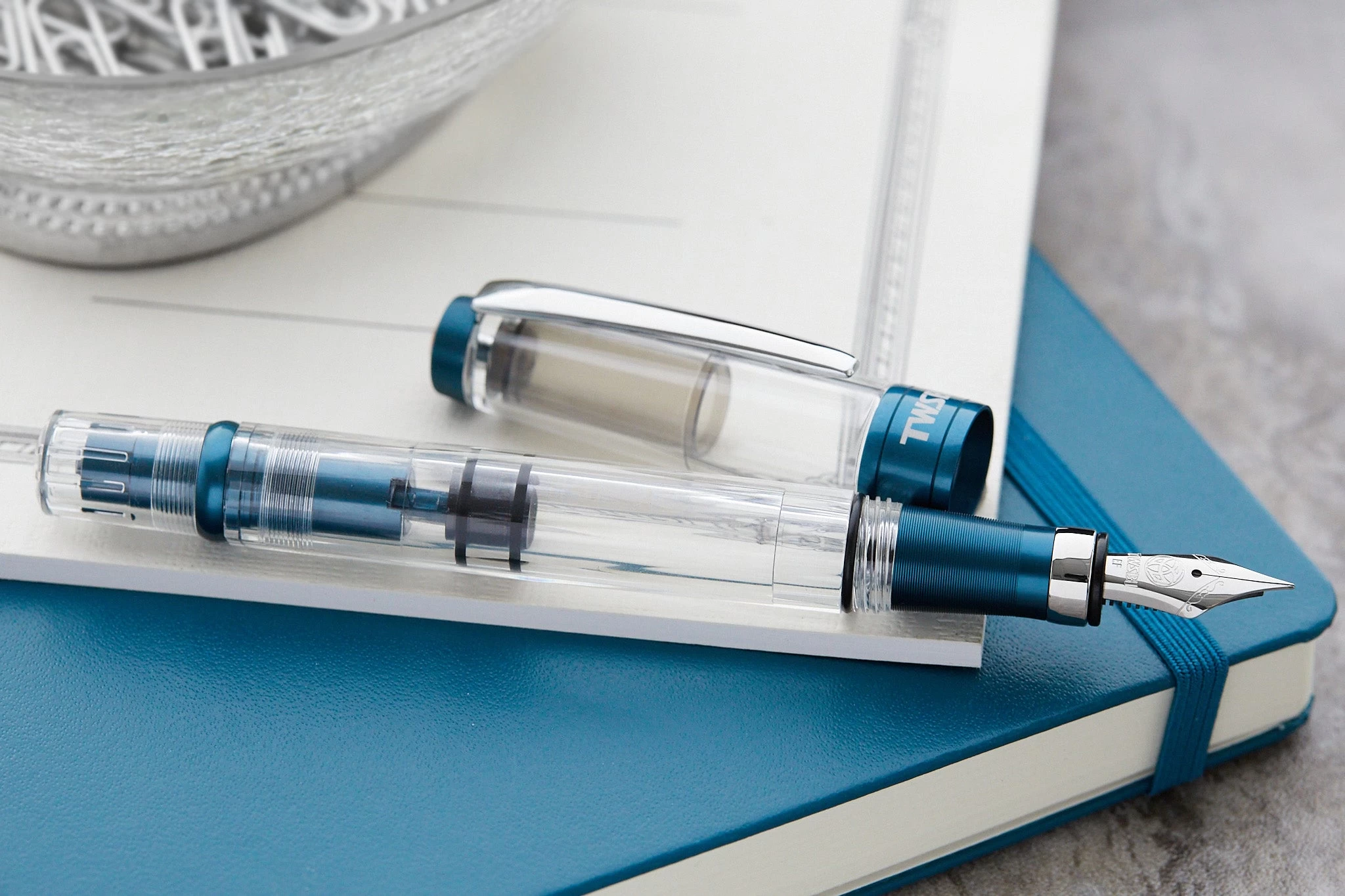 The TWSBI Diamond 580ALR comes with a benchmark piston ink-filling mechanism and has all detachable parts. The clear demonstrator barrel allows you to see your ink color and remaining ink level. This special edition fountain pen has a deep teal blue aluminum grip section, cap ring, and piston knob. The aluminum is enhanced with a subtle matte finish, with circular engravings in the grip and cap area. It comes with a stainless steel nib and is presented in a modern clear display case.