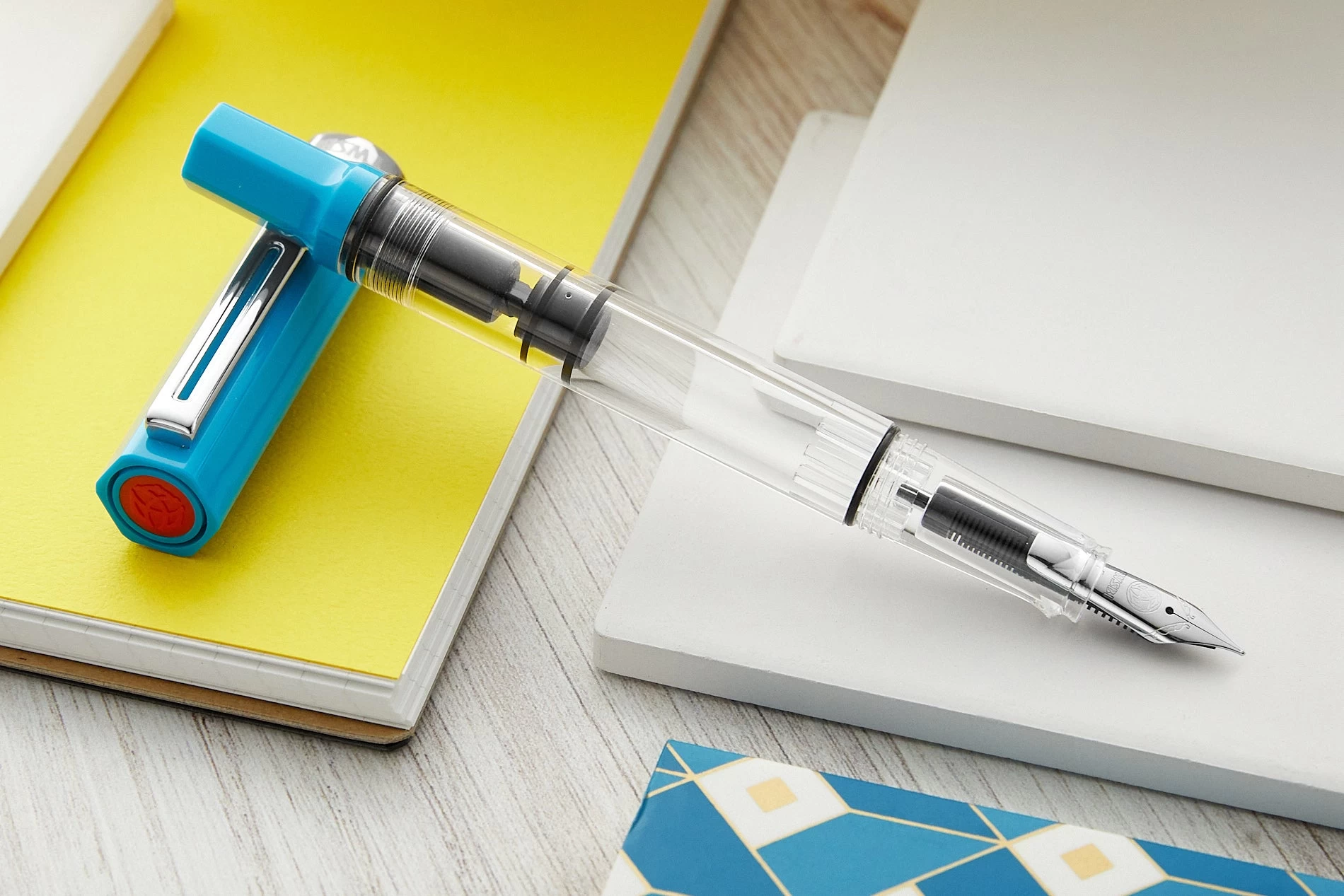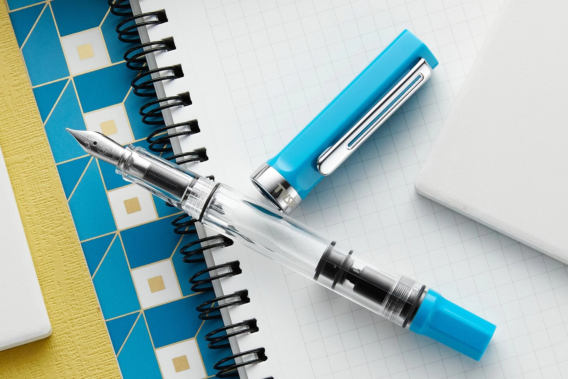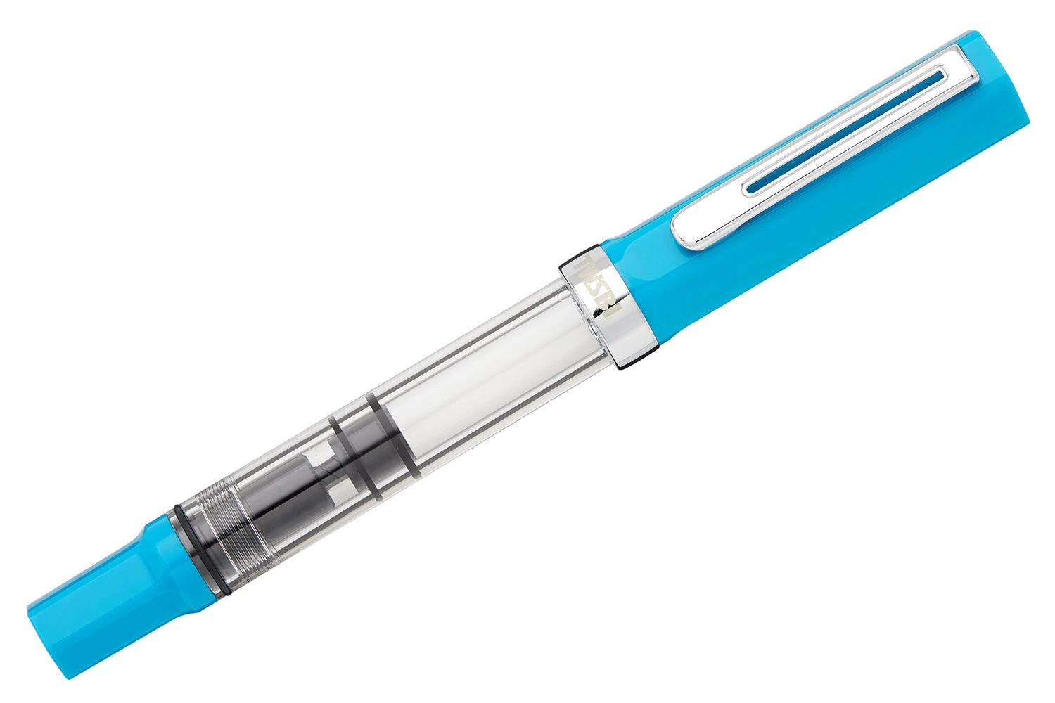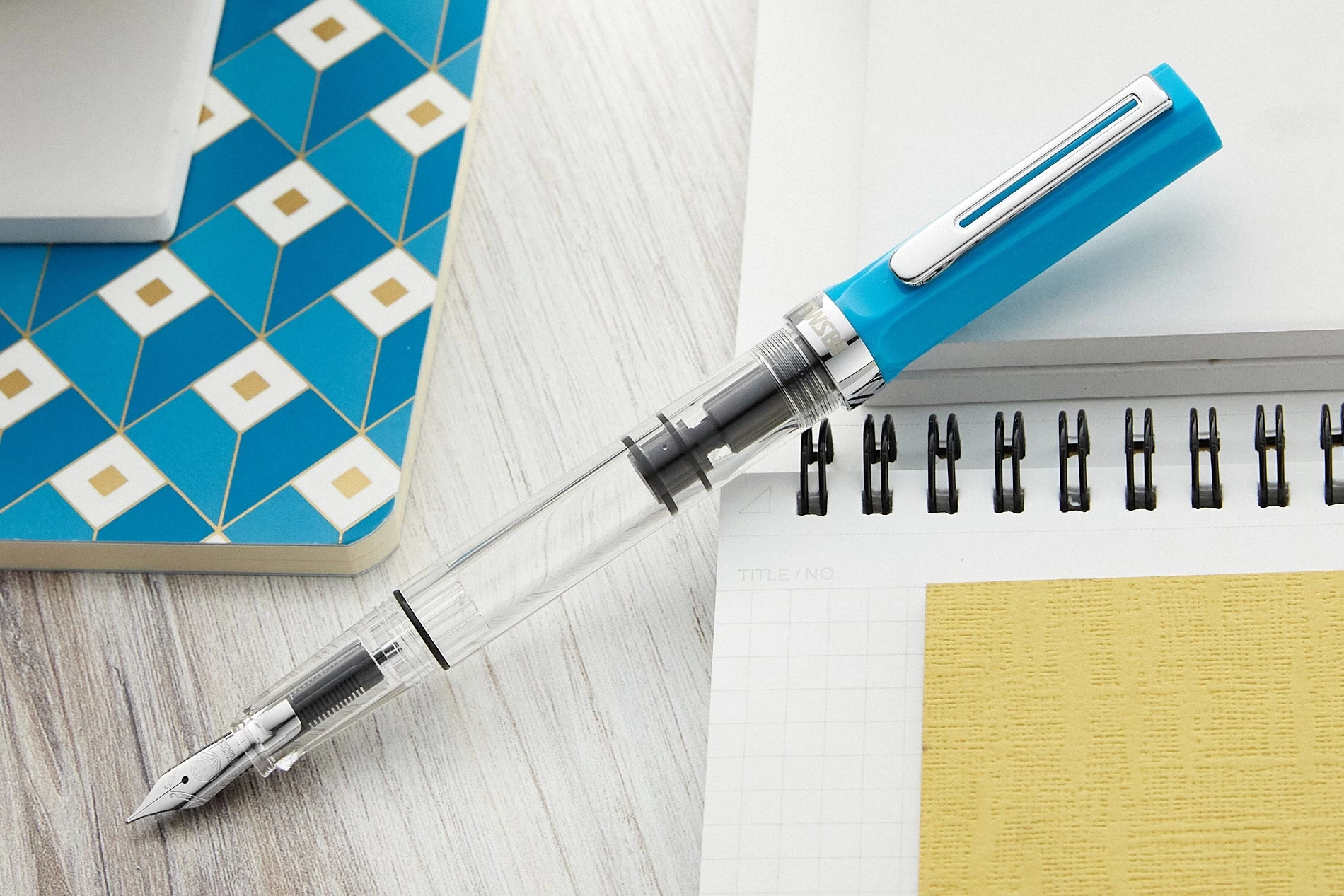 The TWSBI ECO fountain pen boasts an incredible value with its piston filling system and affordable price. Like many other TWSBI fountain pens, it features a crystal clear acrylic barrel so you can see your ink level, and a solid cerulean blue cap and piston knob. The pen cap has an inner cap to ensure a perfect seal when stored away. It is completed with silver trim and a silver stainless steel nib.