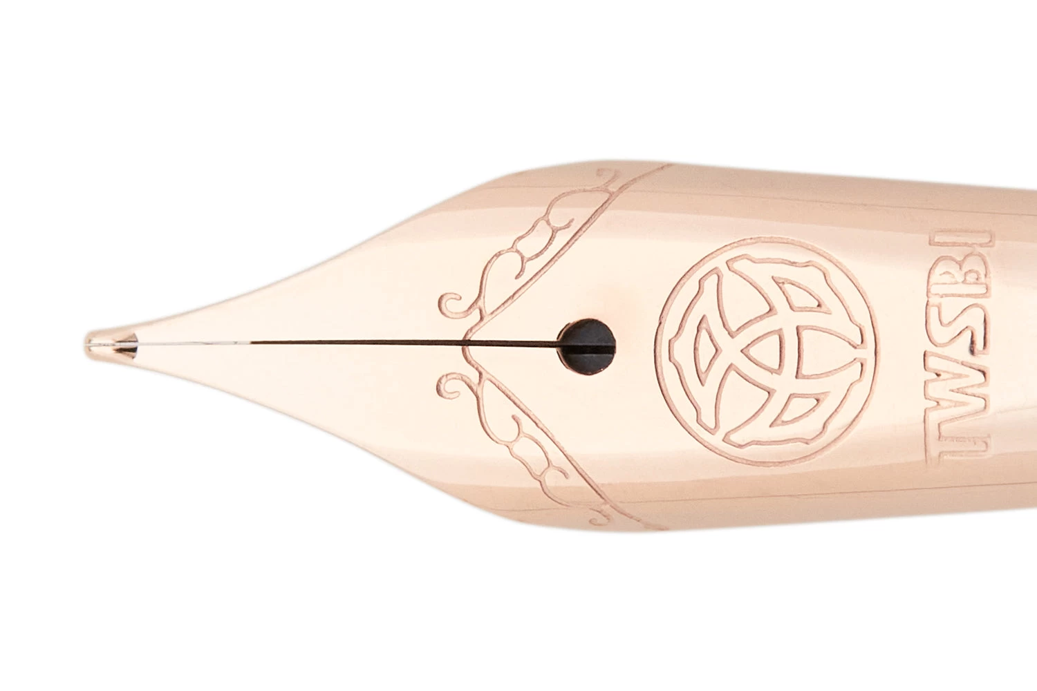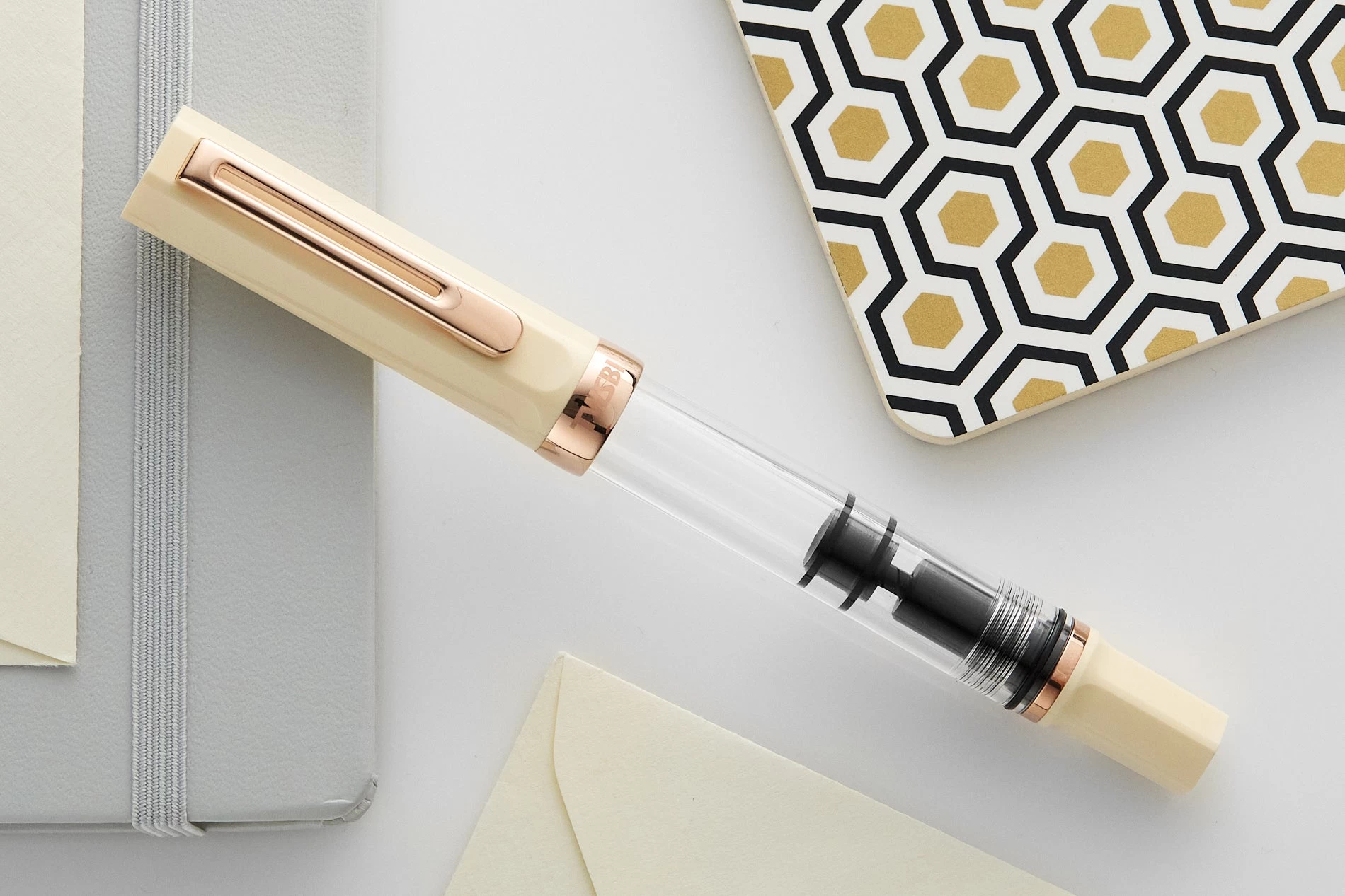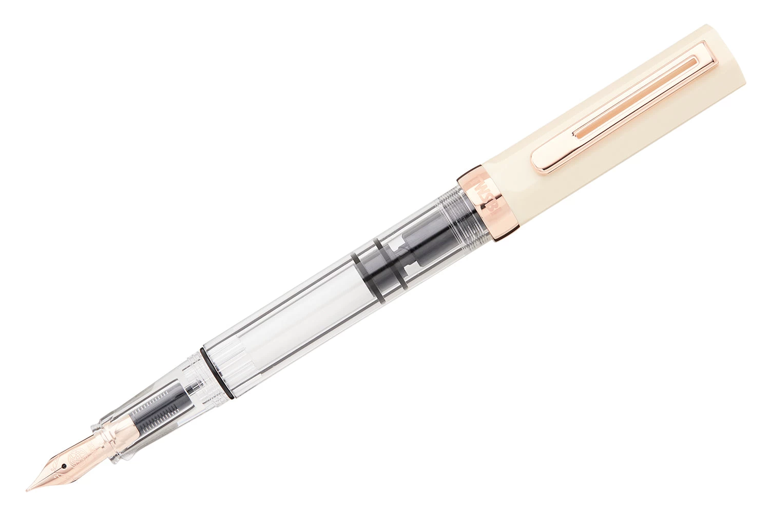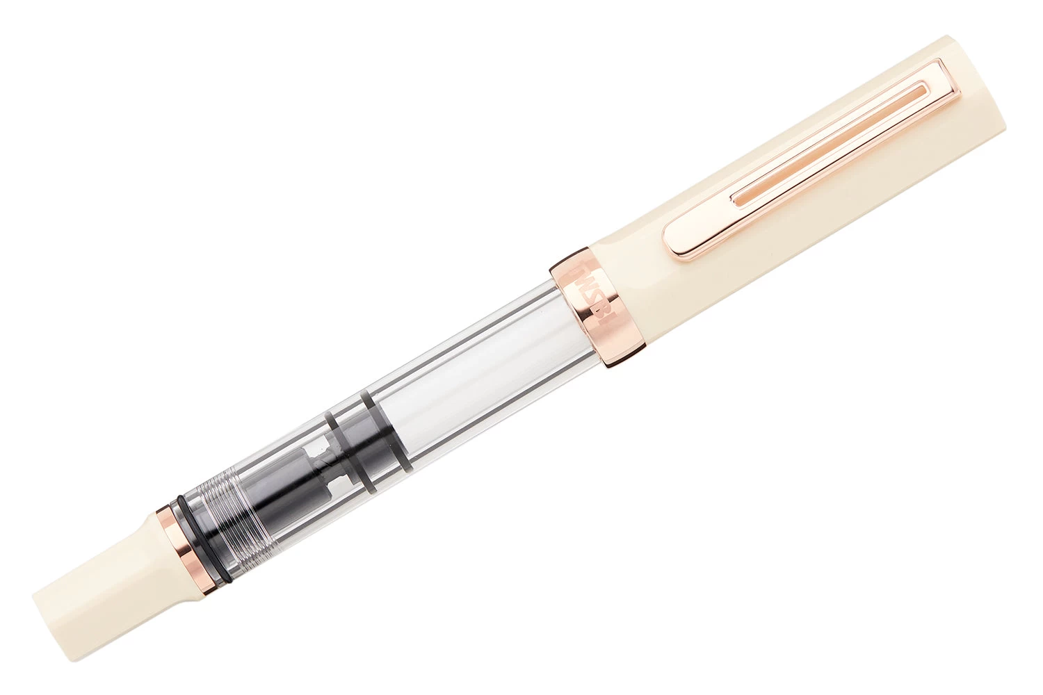 The TWSBI ECO fountain pen boasts an incredible value with its piston filling system and affordable price. Like many other TWSBI fountain pens, it features a crystal clear acrylic barrel so you can see your ink level, and a solid creme colored cap and finial. The pen cap has an inner cap to ensure a perfect seal when stored away. It is completed with rose gold trim and a rose gold-plated steel nib.