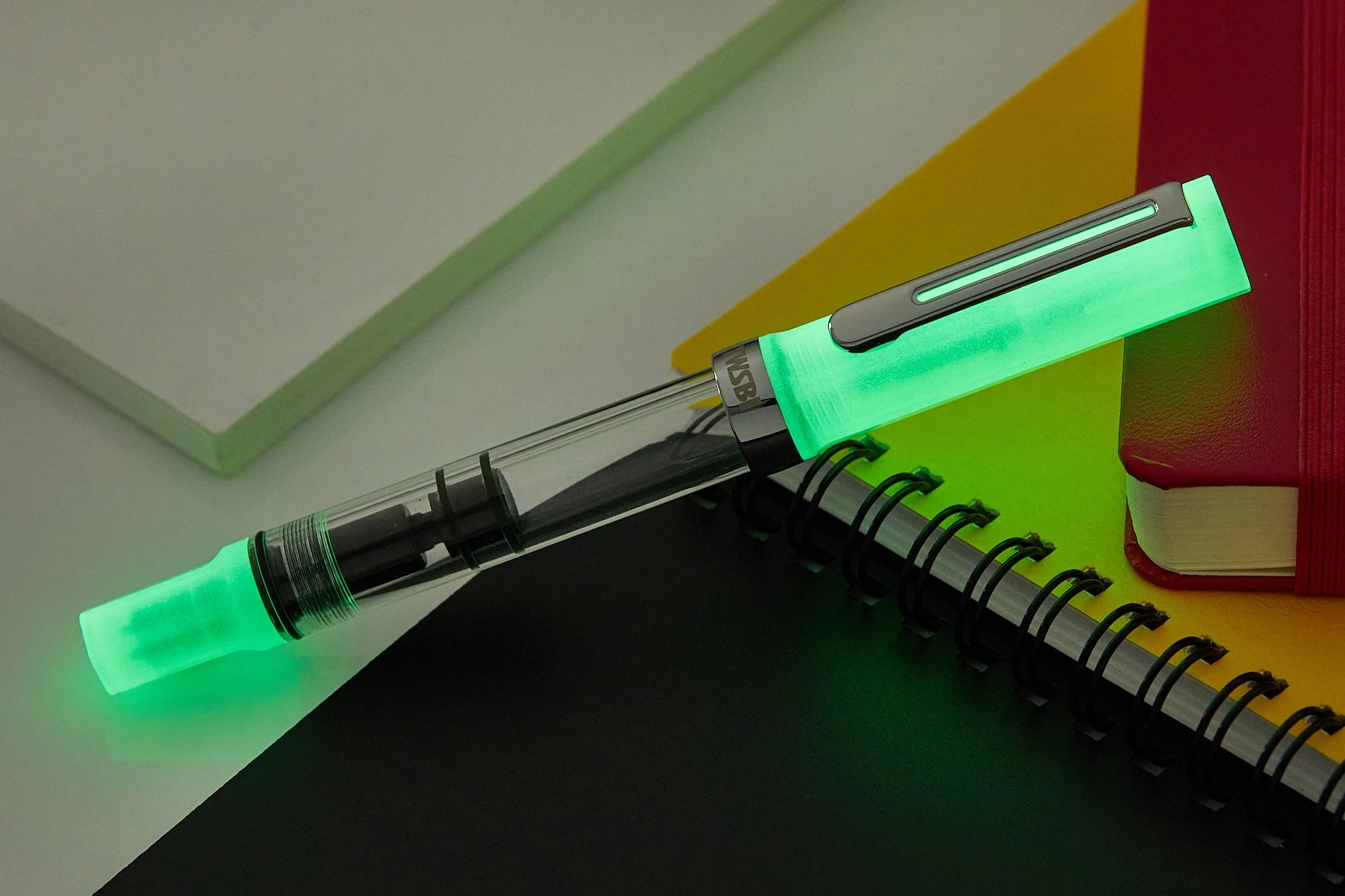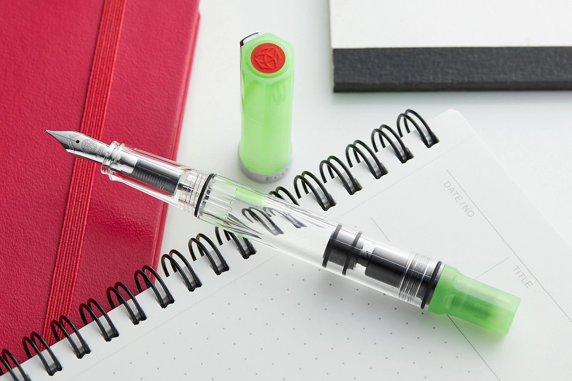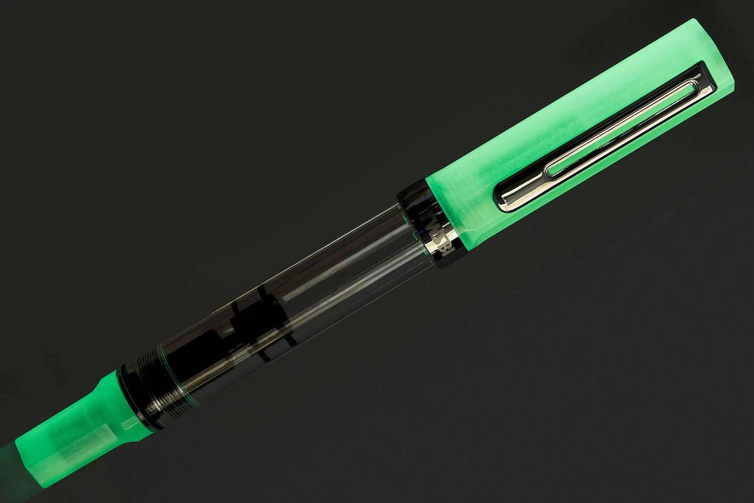 The TWSBI ECO fountain pen boasts an incredible value with its piston filling system and affordable price. Like many other TWSBI fountain pens, it features a crystal clear acrylic barrel so you can see your ink level, and a green cap and piston knob that both glow in the dark! The pen cap has an inner cap to ensure a perfect seal when stored away. It is completed with silver trim and a silver stainless steel nib.
