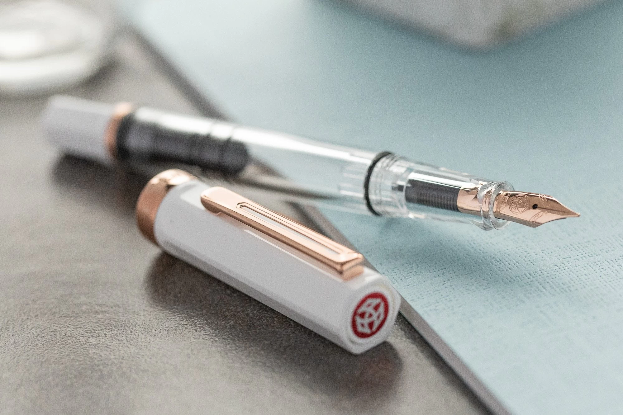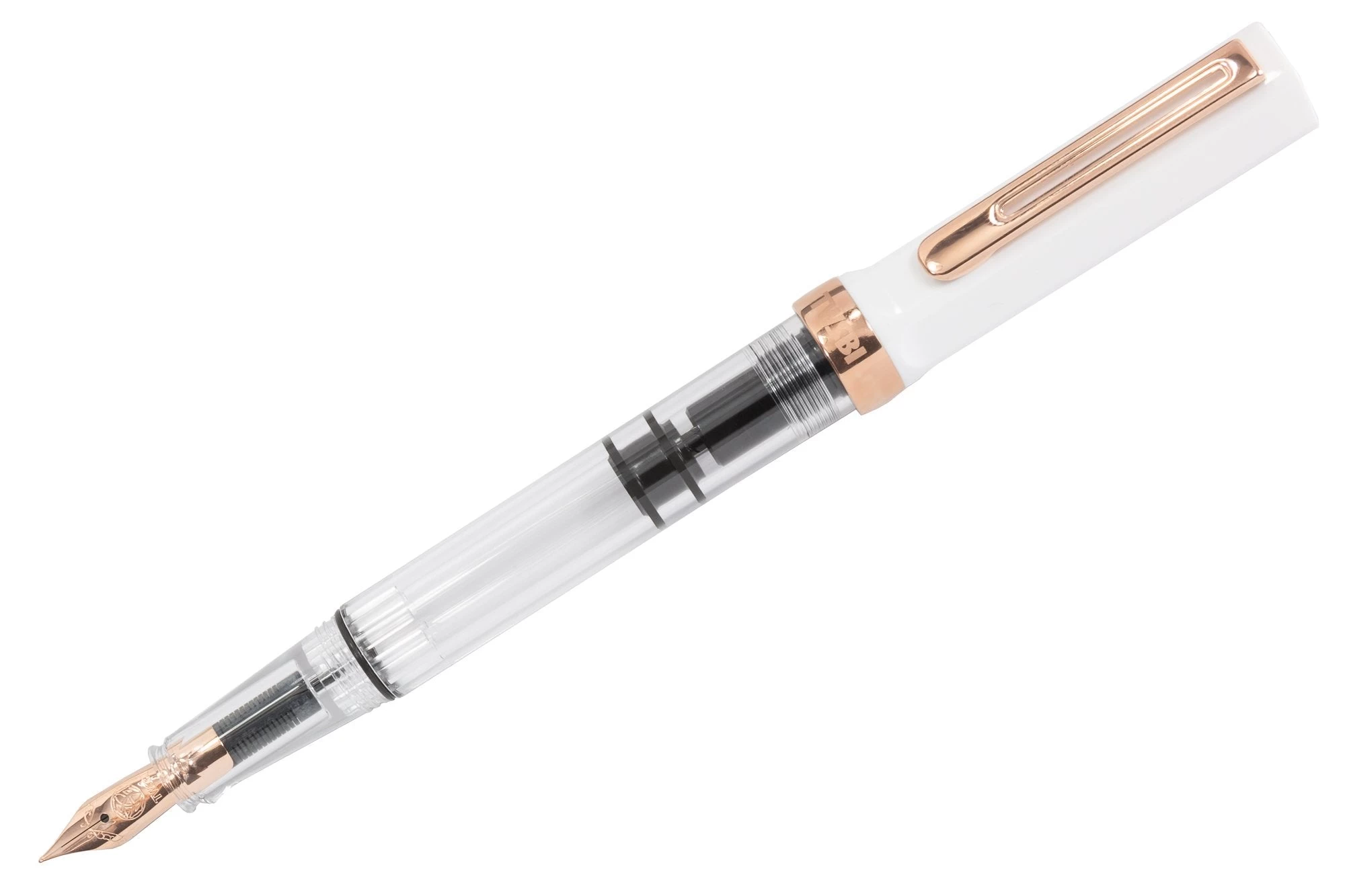 The TWSBI ECO fountain pen boasts an incredible value with its piston filling system and affordable price. Like many other TWSBI fountain pens, it features a crystal clear acrylic barrel so you can see your ink level, and a solid white cap. The pen cap has an inner cap to ensure a perfect seal when stored away. It is completed with rose gold trim and a rose gold-plated steel nib.