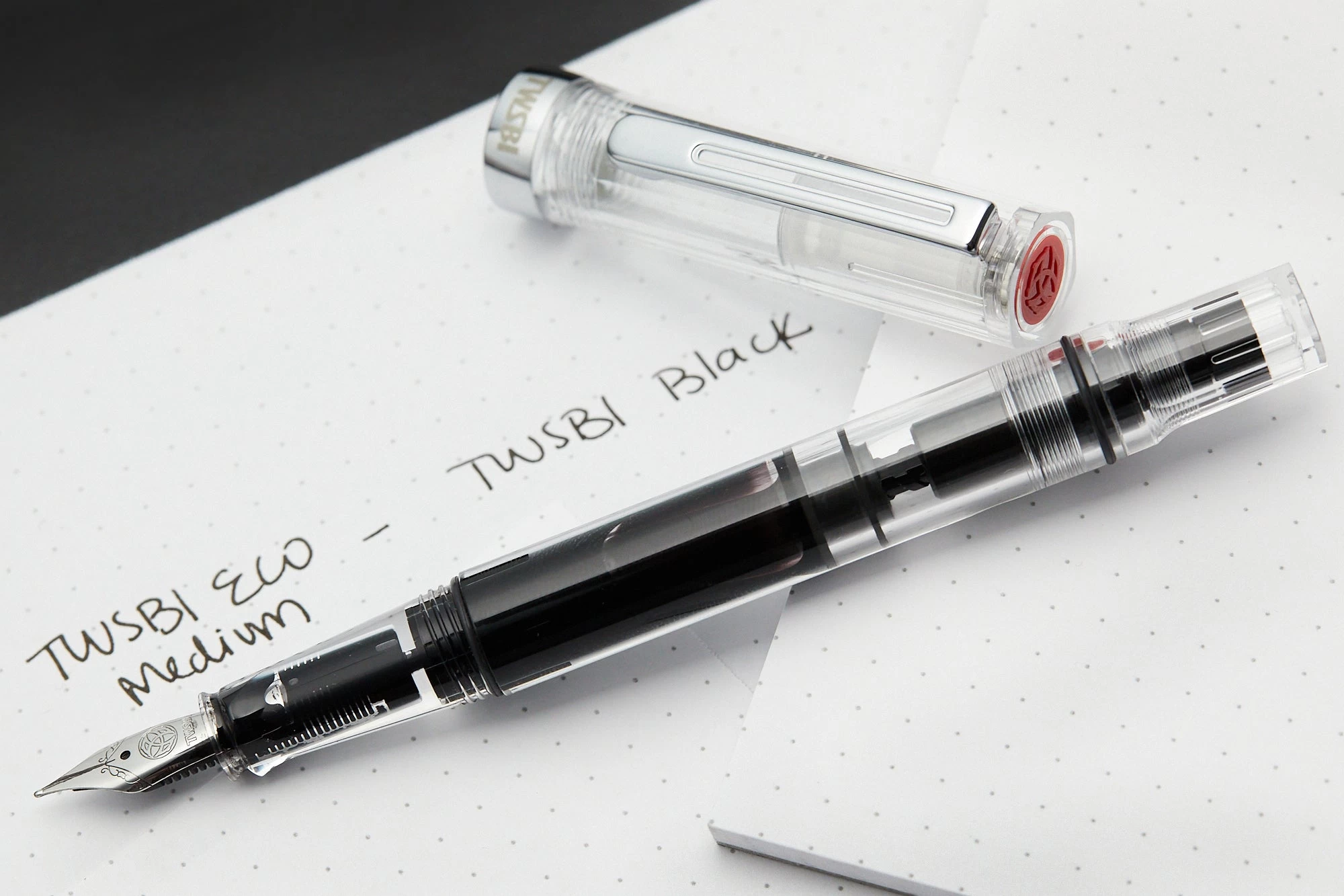 The TWSBI ECO fountain pen boasts an incredible value with its piston filling system and affordable price. Like many other TWSBI fountain pens, it features a crystal clear acrylic barrel so you can see your ink level, and a clear cap. The pen cap has an inner cap to ensure a perfect seal when stored away. It is completed with silver trim and a silver stainless steel nib.