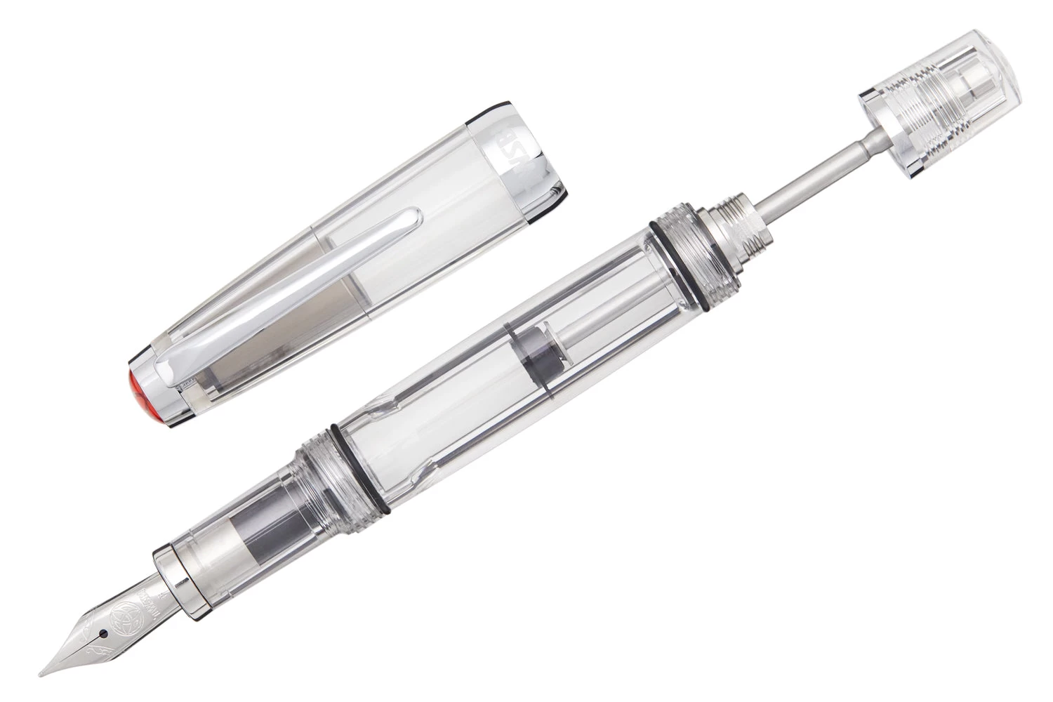 The TWSBI Vac Mini is a slightly shorter version of the Vac700R. This clear demonstrator fountain pen fills via a vacuum filler mechanism and has a stainless steel nib.