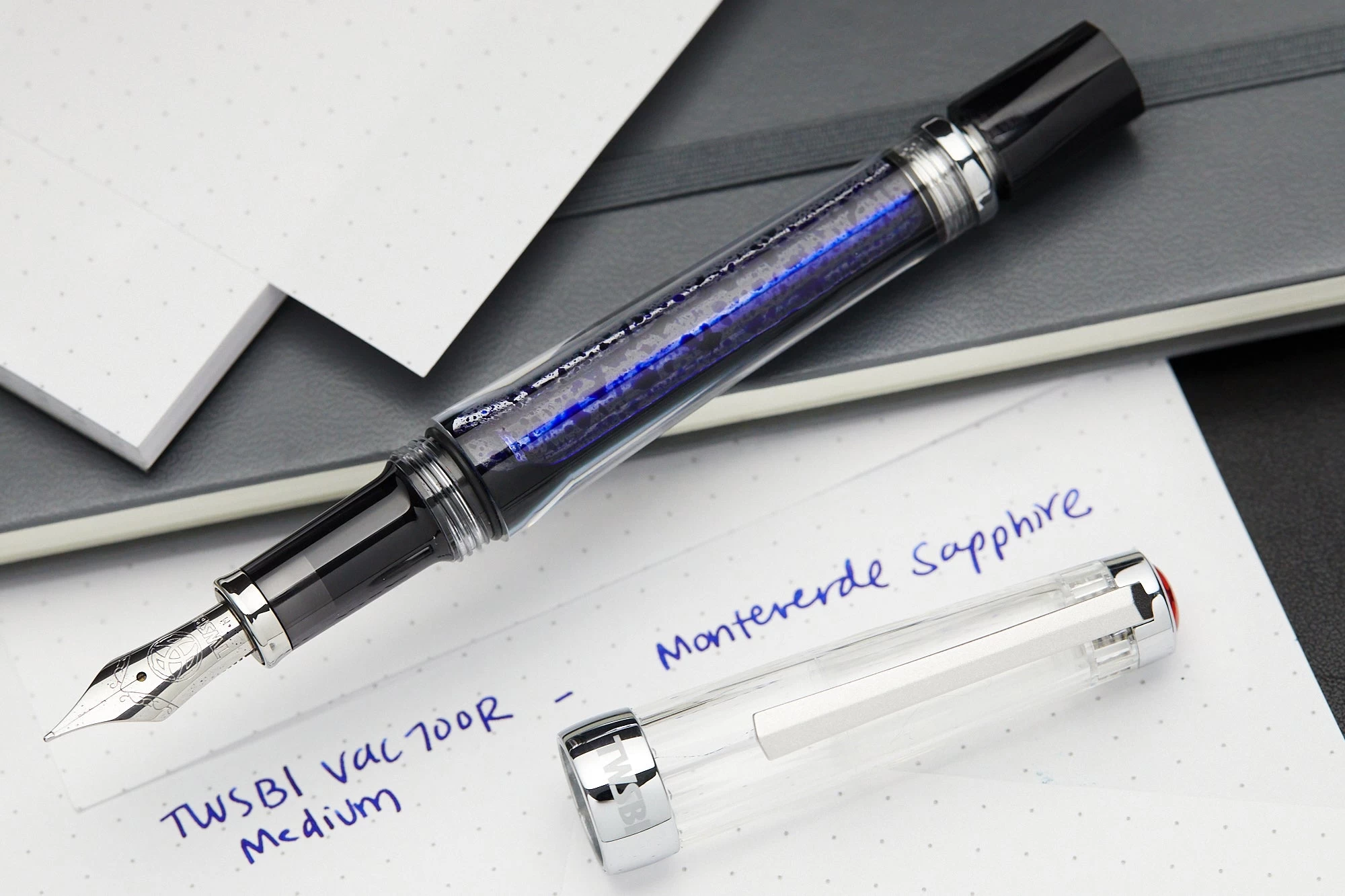 The TWSBI Vac700R comes with a vacuum filler mechanism. This fountain pen features a clear demonstrator body with a stainless steel nib.