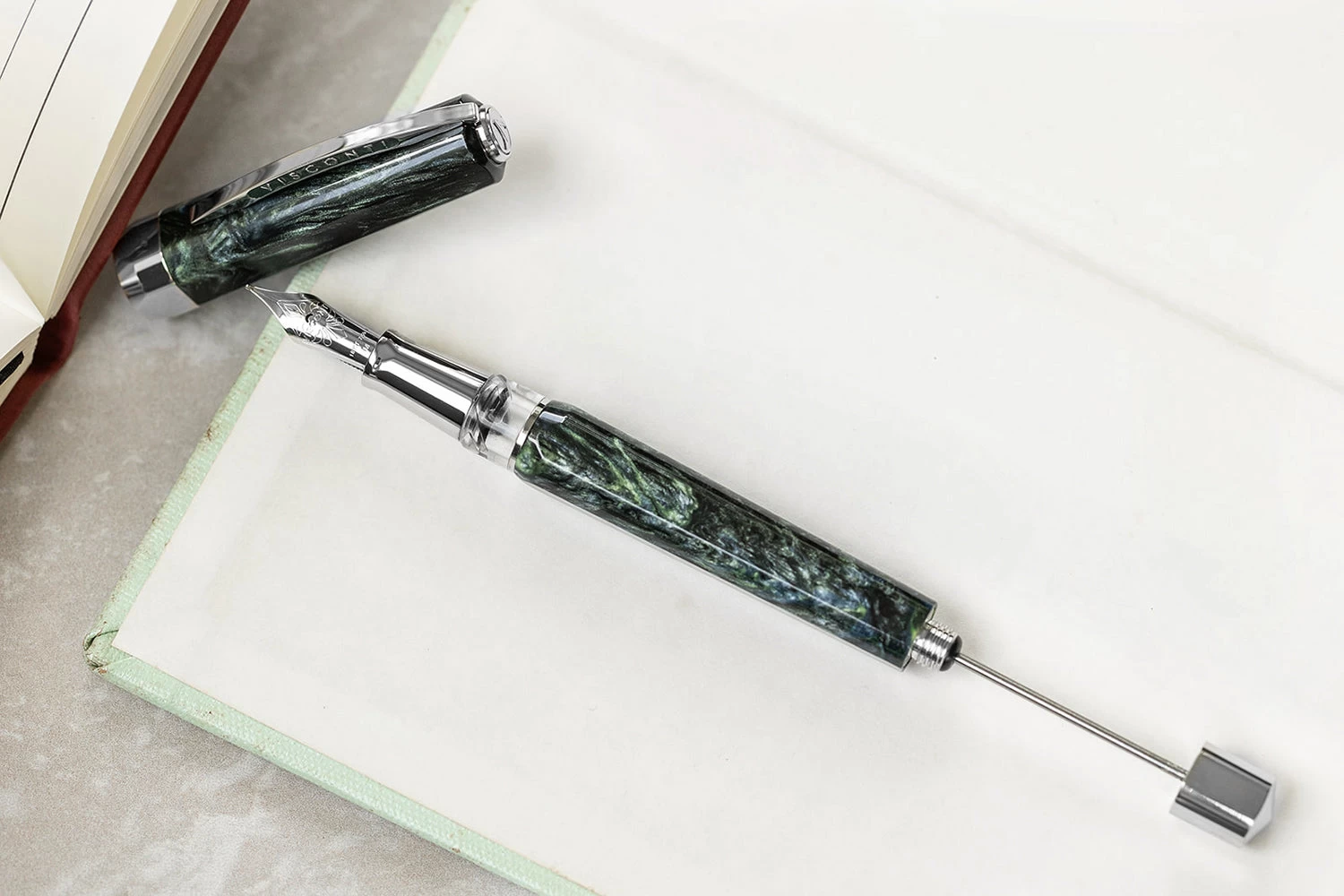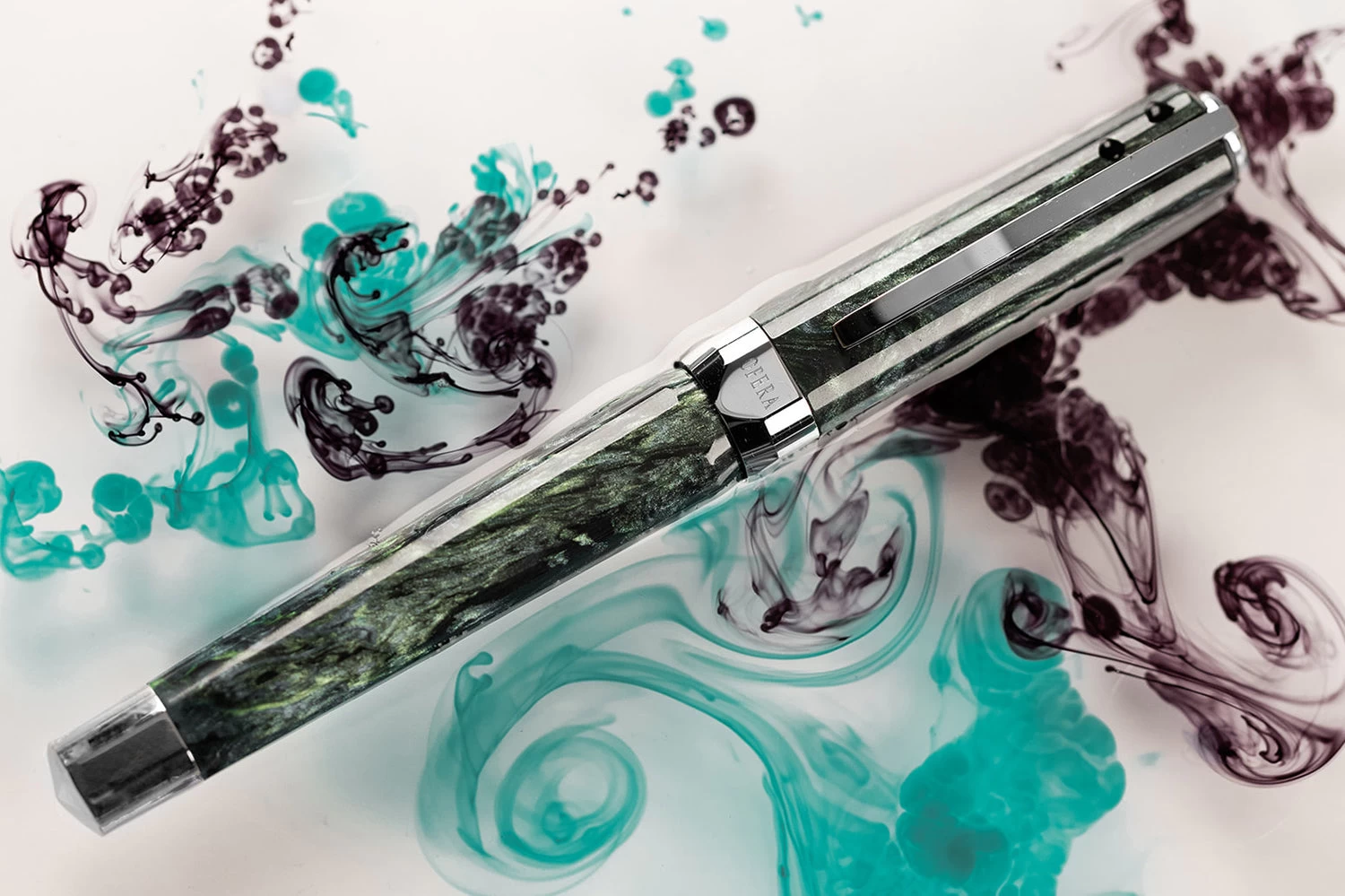 This fountain pen features a vibrant swirly green body and cap with hints of blue. The beloved Ponte Vecchio bridge clip features a sparkling teal enamel to accent the Visconti name. It is accented with palladium trim.